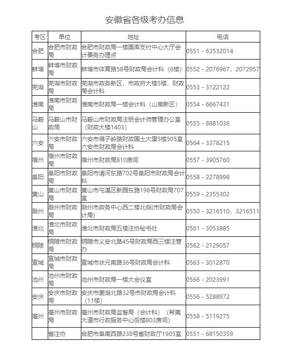 考虑到合肥、芜湖、蚌埠考区参加会计科目考试的考生较多,考点和机位可能出现紧张,为优化上述考区会计科目考点和机位资源,2019年合肥、芜湖、蚌埠考区会计科目安排两场考试,考试时间分别为2019年10月20日 08:30-11:30、 13:30-16:30 。财政部注册会计师考试委员会办公室(简称财政部考办)将根据报名情况统筹安排考生参加相关场次的考试。相关考区涉及的考生可在2019年5月15日后登录网报系统查询考试时间安排,并以准考证上载明的时间为准参加考试。